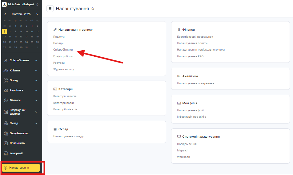 Налаштування – розширені або додаткові параметри співробітника.