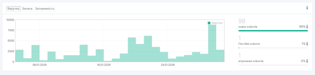 - Нові клієнти. Кількість клієнтів, які здійснили перший візит за обраний період.