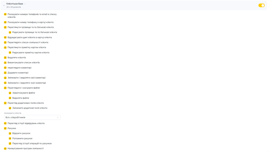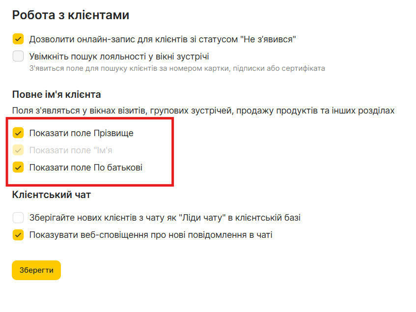 Ви можете увімкнути відображення одразу двох полів або лише одного. Залежно від налаштувань прав доступу, користувач буде бачити лише ім’я та першу літеру прізвища клієнта або буде бачити повне ПІБ.