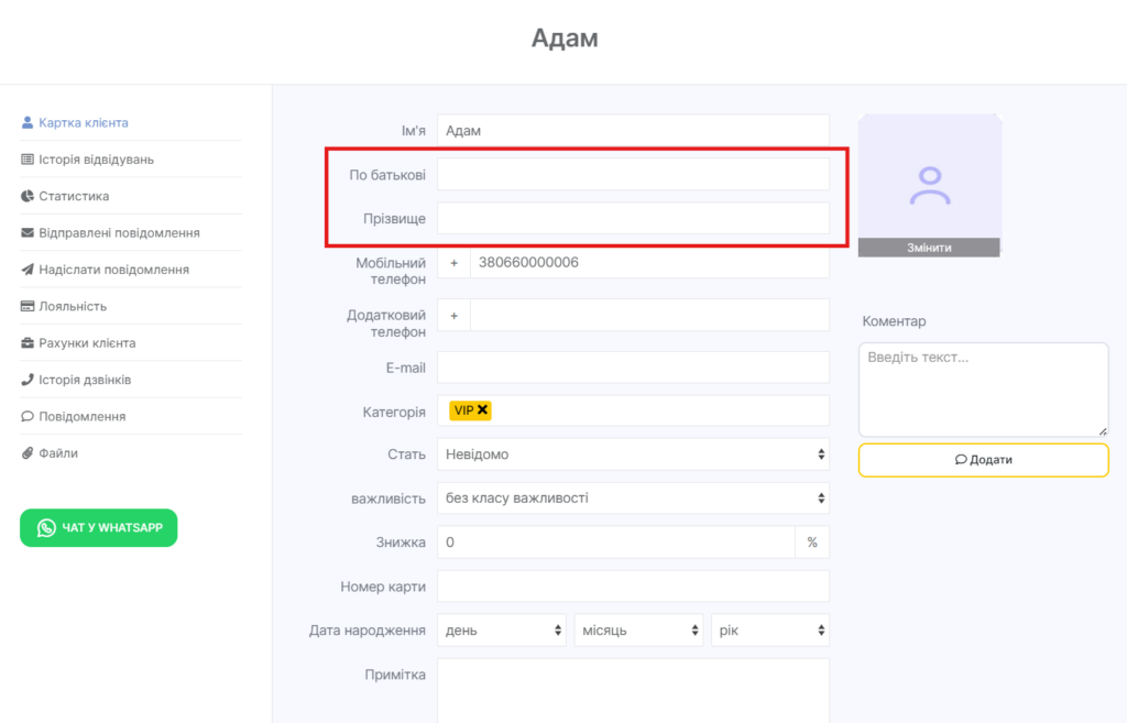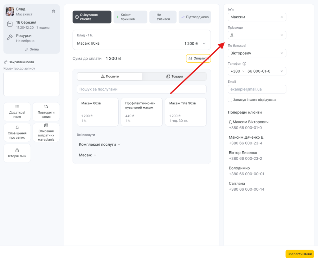 Після налаштування журналу запису в інтерфейсі взаємодії з клієнтом поруч з полем Ім’я з’являться нові поля – Прізвище та По батькові.