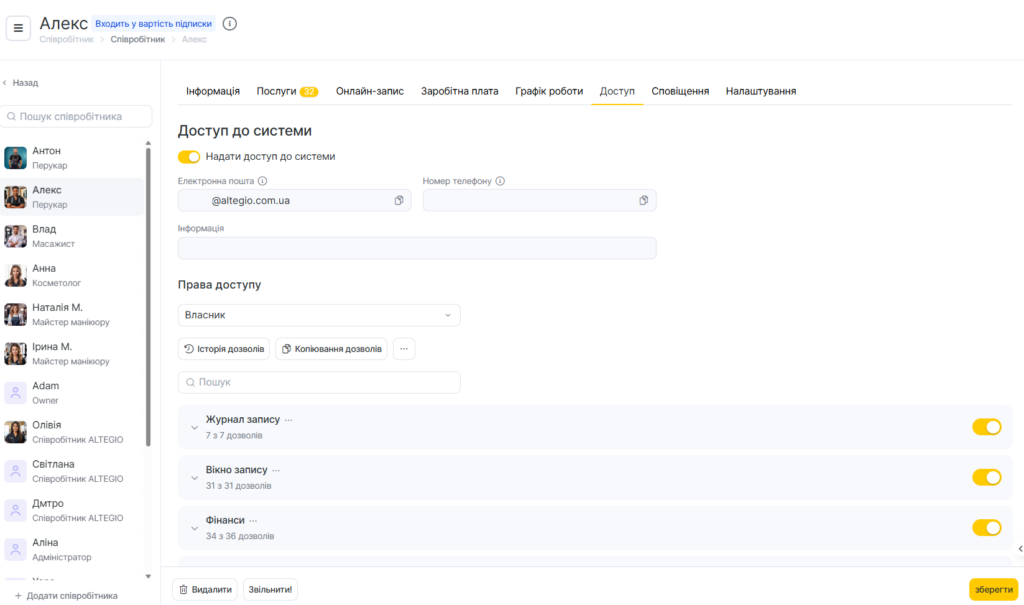 - Перейдіть до розділу Співробітники > Список співробітників натисніть на ім’я користувача і перейдіть на вкладку Доступ.