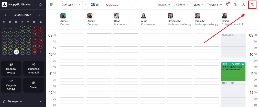 - Щоб повторити запис до співробітника, натисніть кнопку Графік роботи співробітника, далі відкриється графік спеціаліста в журналі на тиждень, виберіть потрібний час і створіть запис.
