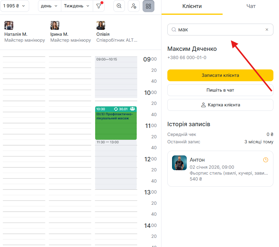 - Введіть ім’я або номер телефону клієнта та виберіть його зі спадаючого списку. Якщо клієнт не відображається, але дані вірні, це означає, що він ще не доданий до клієнтської бази. У такому випадку необхідно створити запис в журналі, після чого клієнт буде автоматично доданий до клієнтської бази. Також картку клієнта можна створити вручну в клієнтській базі (докладніше про це читайте в статті).