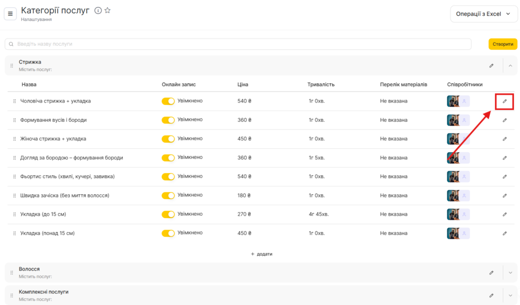 - На сторінці, що відкрилася, натисніть на назву послуги або на значок олівця, щоб перейти до налаштувань.