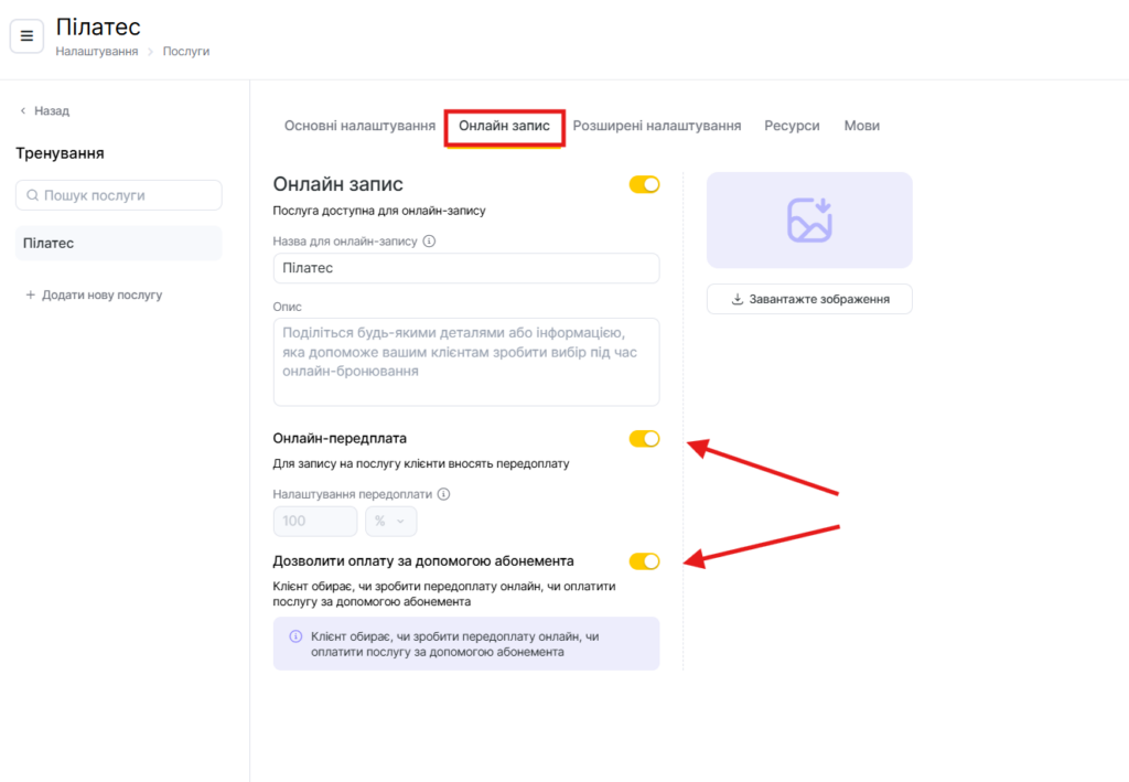 Якщо у вашій філії для індивідуальних послуг увімкнено обов’язкову або необов’язкову оплату, під час налаштування послуг ви можете обрати або онлайн-передоплату, або заборону онлайн-запису без абонемента — одночасно обидві опції обрати неможливо.
