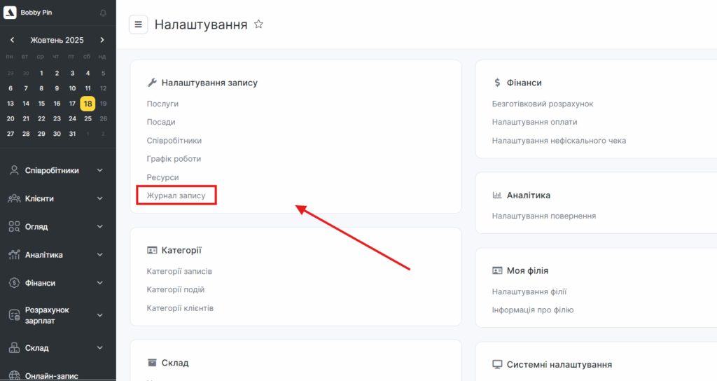 Перейдіть у головному меню до розділу Налаштування > блок Налаштування запису > Послуги.