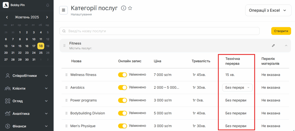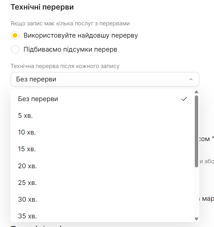 Розкрийте потрібну категорію з послугою. У списку послуг у блоці Технічна перерва виберіть тривалість — від 0 (без перерви) до 1 години з інтервалом у 5 хв. Після вибору налаштування одразу збережеться.