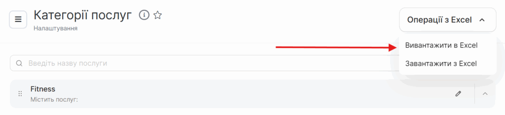Вивантажте послуги в Excel через кнопку Операції з Excel → Вивантажити в Excel.
