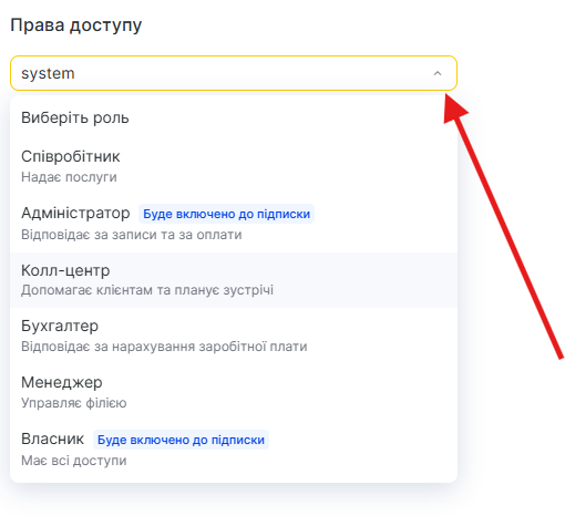 - Щоб змінити роль, натисніть на випадаючий список у полі Права доступу. Якщо повернутися до попередньої ролі, налаштування збережуться.