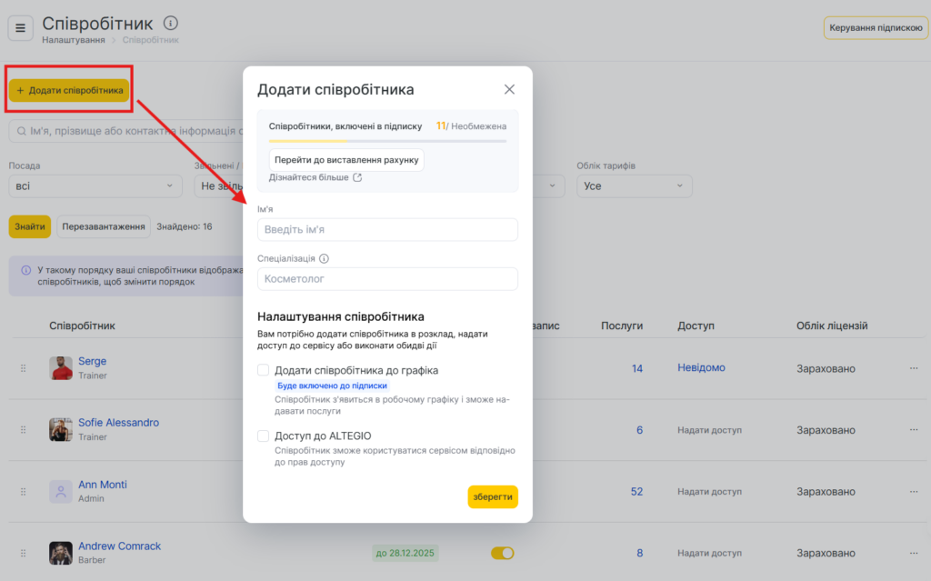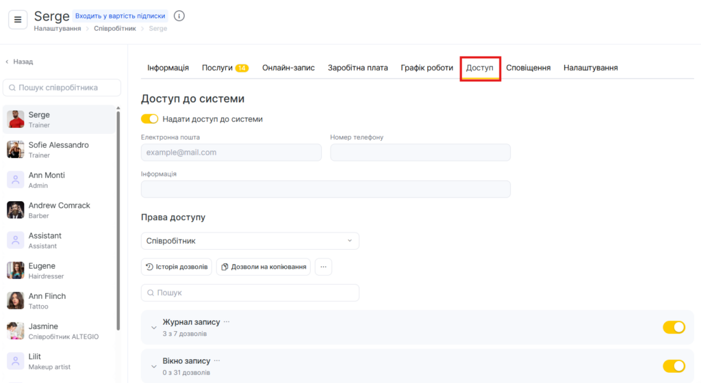 - Доступ до Altegio — співробітник зможе входити в систему та користуватися сервісом відповідно до призначених прав доступу.