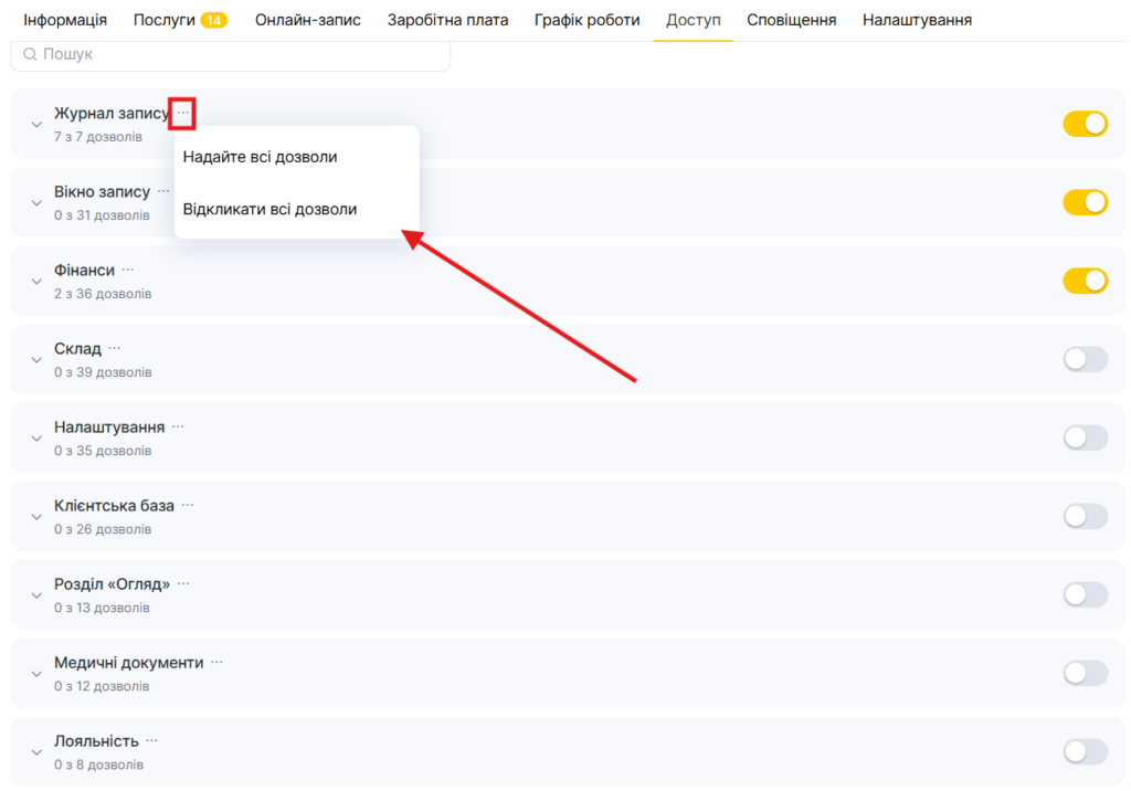 - Щоб надати або прибрати права для ролі, натисніть на три точки в полі Права доступу та виберіть потрібний параметр.
