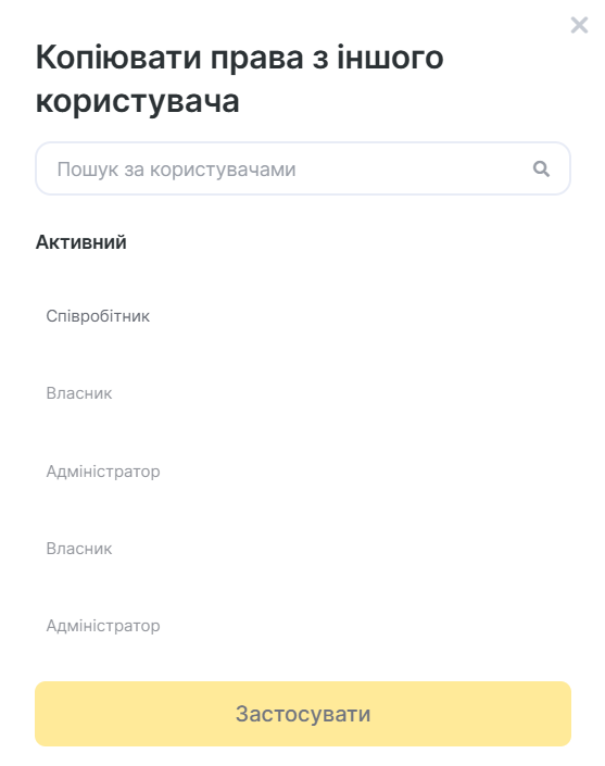 - Виберіть співробітника зі списку, права якого потрібно скопіювати. За потреби скористайтеся пошуком. Натисніть кнопку Застосувати.