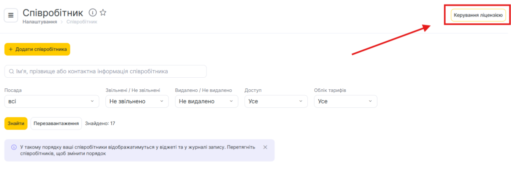 - Перейдіть у головному меню до розділу Налаштування > Співробітники > Керування ліцензією.