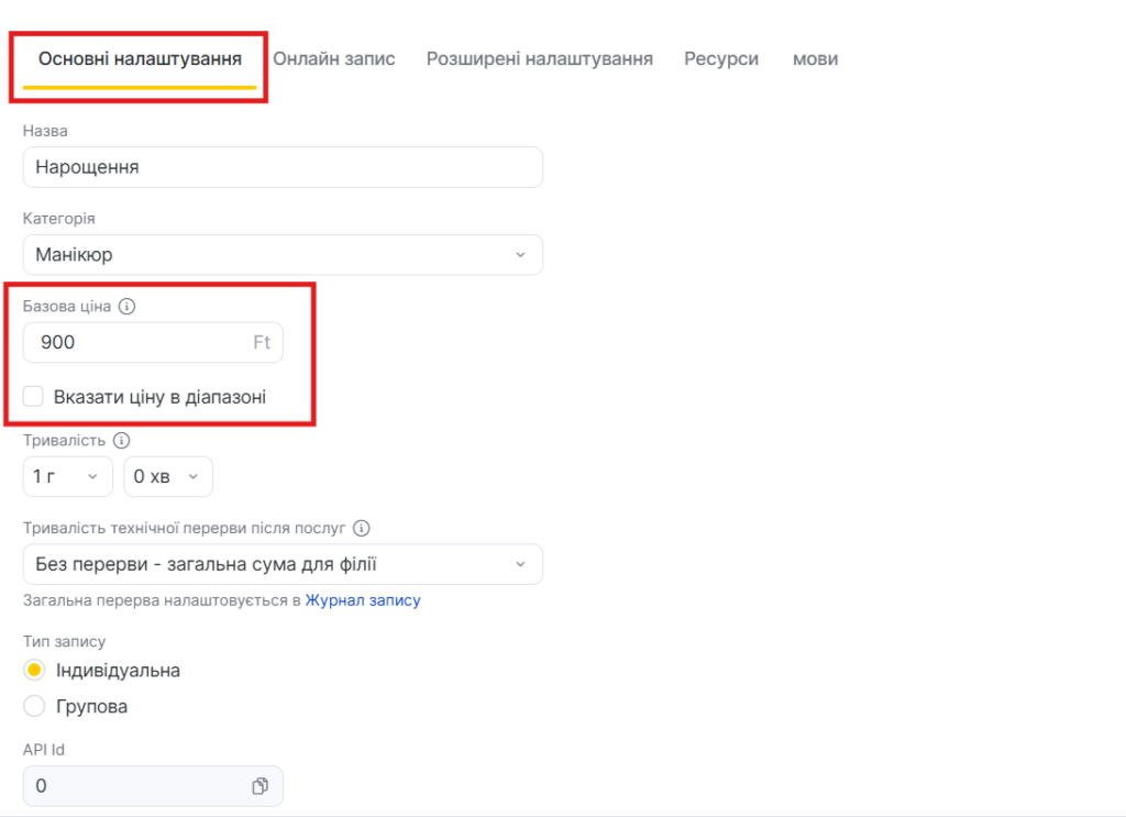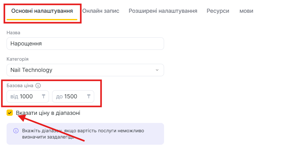 - У полі Базова ціна краще вказати ту ціну за послугу, яка найчастіше використовується різними співробітниками. Ця ціна буде проставлена всім співробітникам, призначеним на послугу, у яких не встановлені індивідуальні ціни. Також можна вказати базову ціну в діапазоні — докладніше про це читайте далі в статті у розділі Встановлення цін у діапазоні.