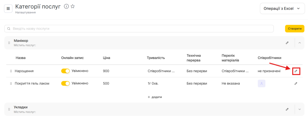 - Розкрийте потрібну категорію й натисніть на назву послуги або на кнопку редагування із зображенням олівця навпроти послуги.