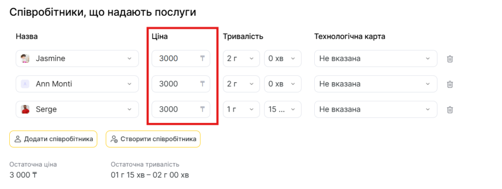 Якщо ви не хочете встановлювати різні ціни для співробітників, то в полі Ціна можна не вносити змін — тоді там буде встановлена базова ціна послуги.