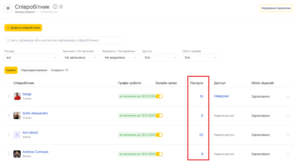 - Натисніть на ім’я співробітника або на напис Не надає / число у стовпці Надає послуг.