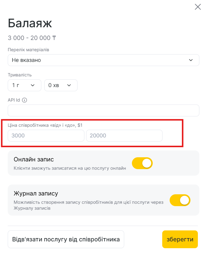 У разі, якщо в налаштуваннях послуги вказана базова ціна в діапазоні, для співробітників також можна вказати ціну в діапазоні. Це налаштування корисне, якщо ціна на послугу в одного й того самого співробітника може відрізнятися, наприклад, залежно від складності виконання.
