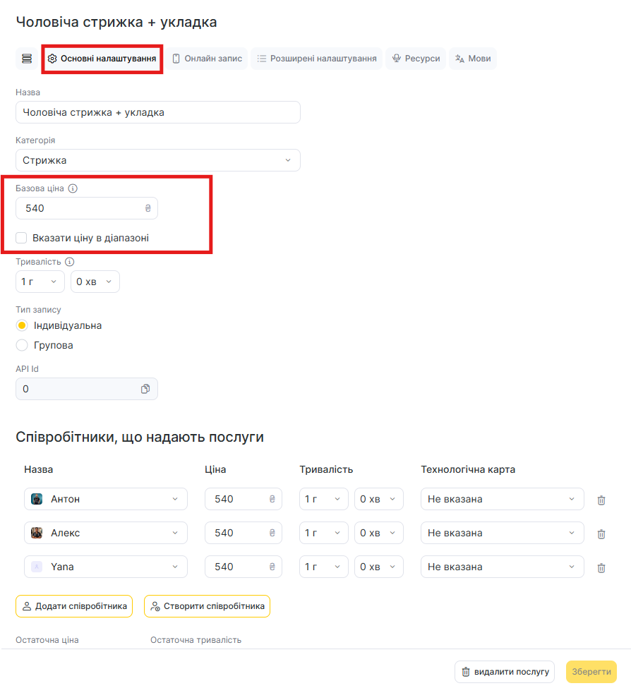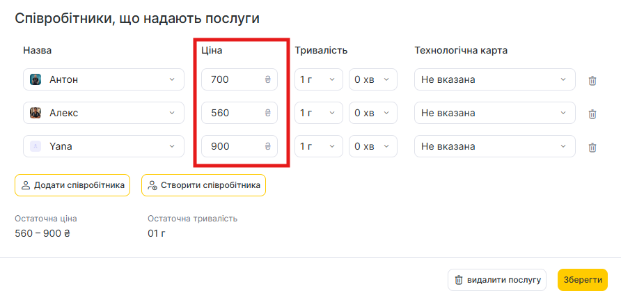 Якщо ви не хочете встановлювати різні ціни для співробітників, то в полі Ціна можна не вносити змін — тоді там буде встановлена базова ціна послуги.