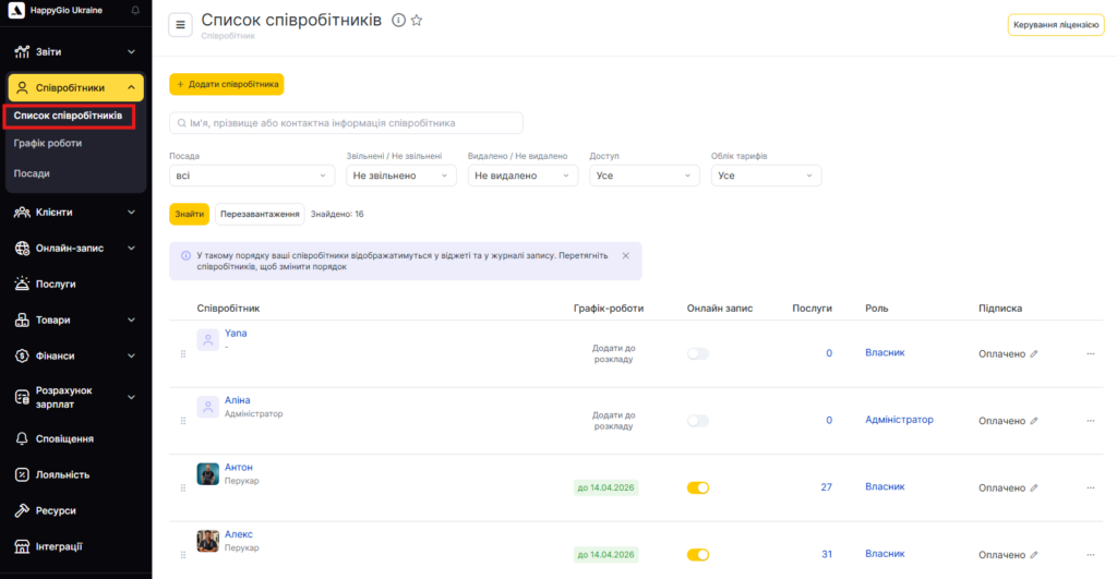 - Перейдіть у розділ Співробітники > Список співробітників у режимі Адміністрація.