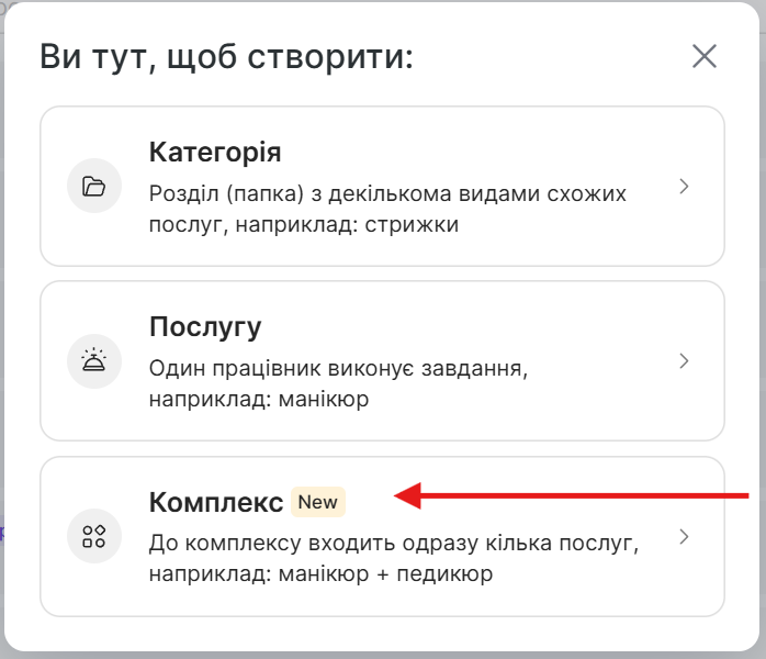Комплексні послуги все ще доопрацьовуються та згодом будуть доступні всім користувачам Altegio. Якщо комплекси для вас ще недоступні, зверніться до техпідтримки Altegio або вашого менеджера (контакти — Огляд → Зведення). Ваша зворотна реакція дуже допоможе нам у доопрацюванні комплексів.