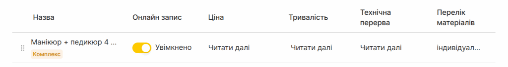 Поки що налаштування комплексів доступне лише для індивідуальних послуг і у вебверсії програми. Незабаром комплекси з’являться й у мобільному застосунку Altegio.