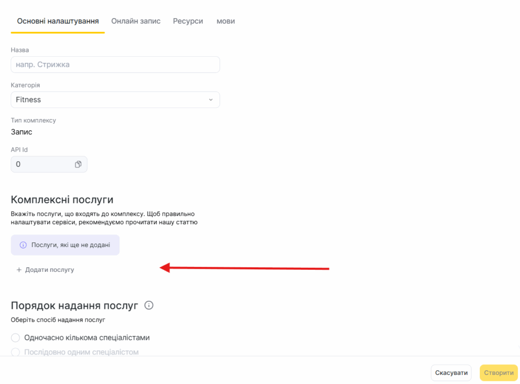 У блоці “Послуги комплексу” натисніть на “Додати послугу”.