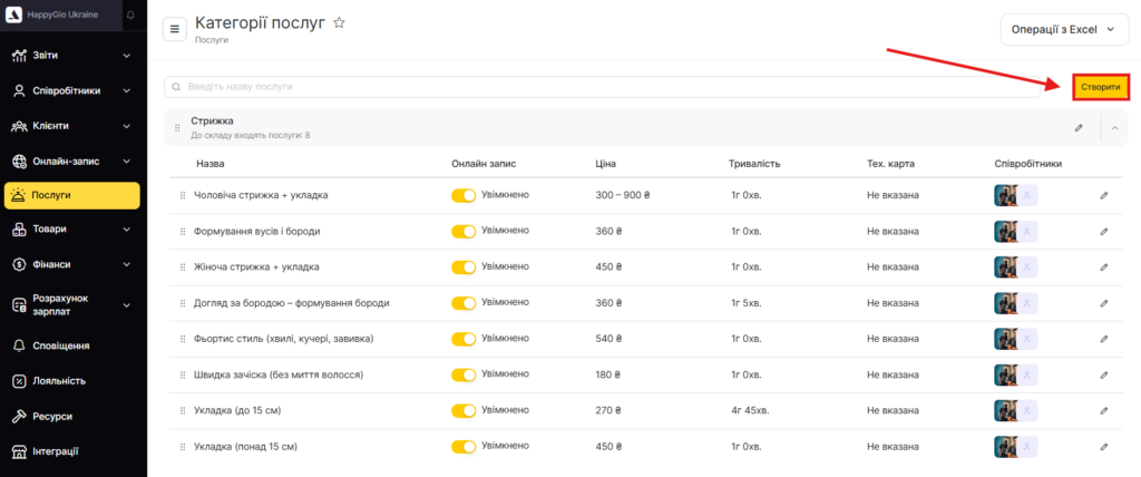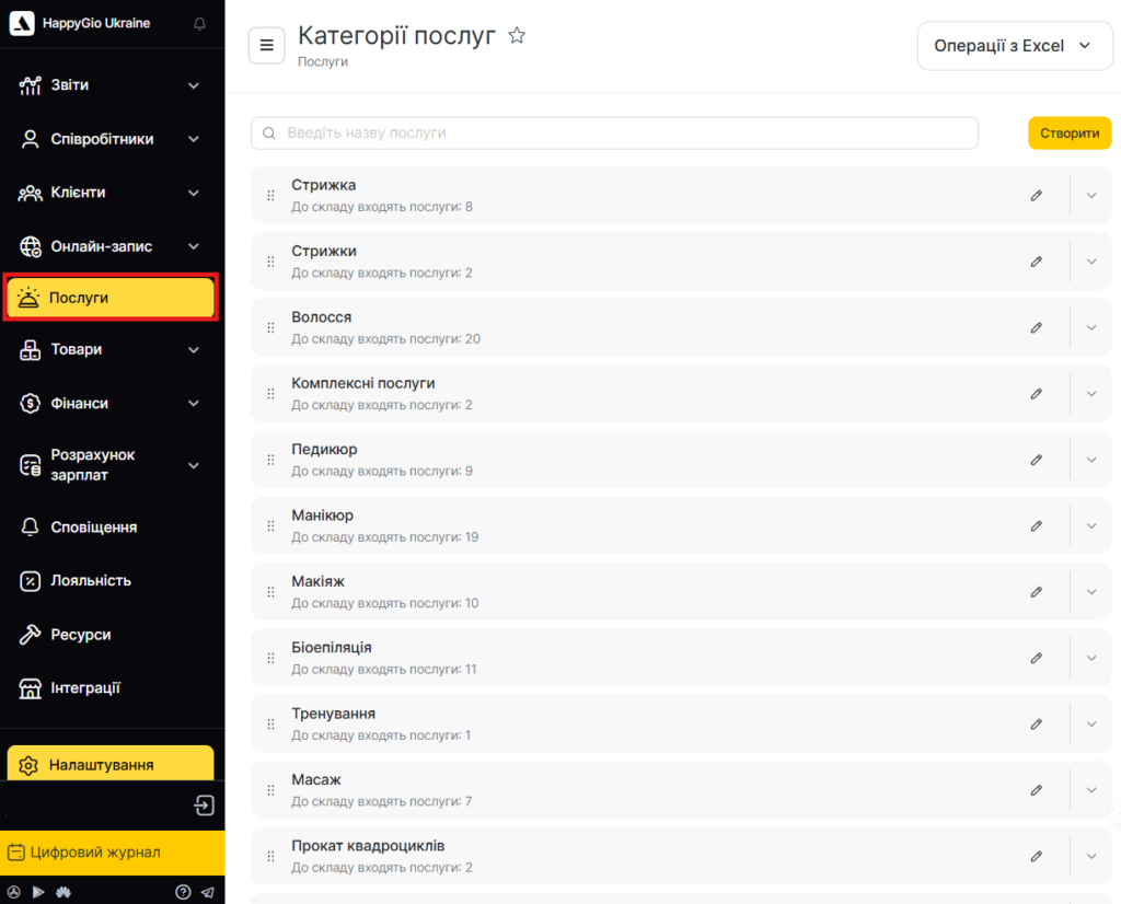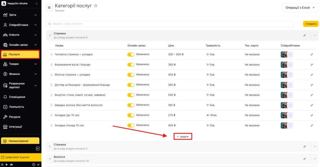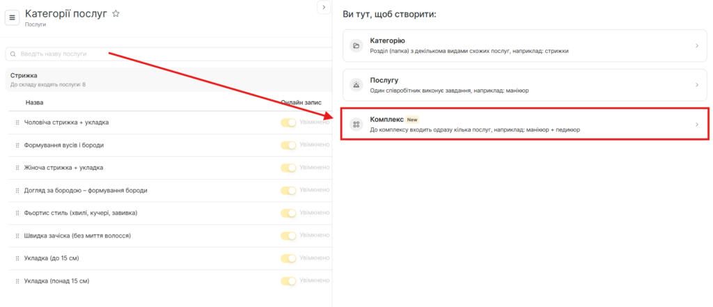 - Якщо категорія послуг для комплексу вже створена, розкрийте її. Якщо ні — створіть нову. Детальніше про створення категорій читайте тут.