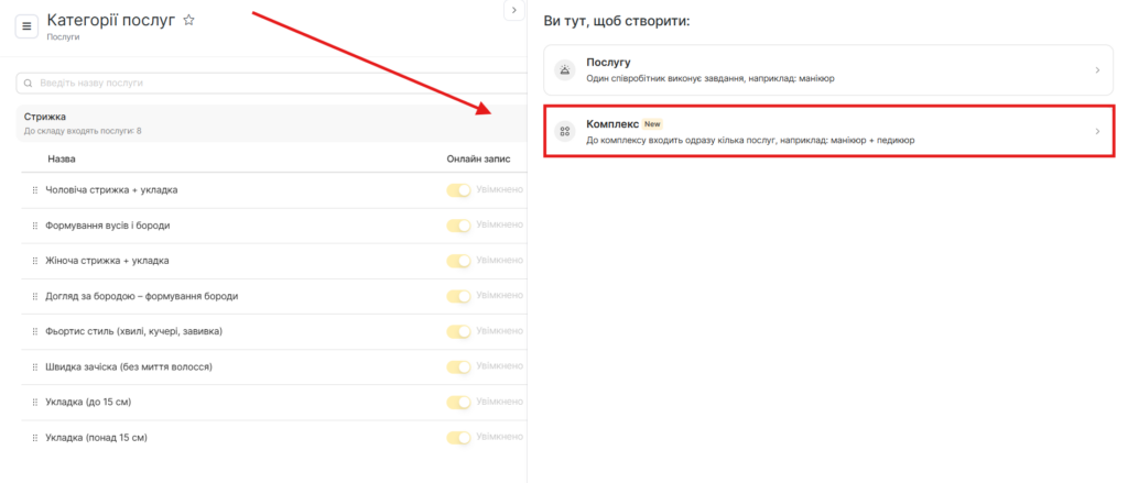 - Після заповнення даних натисніть кнопку Створити, а якщо редагуєте вже створений комплекс — Зберегти. Створені комплекси будуть позначені відповідним значком Комплекс у налаштуваннях послуг.