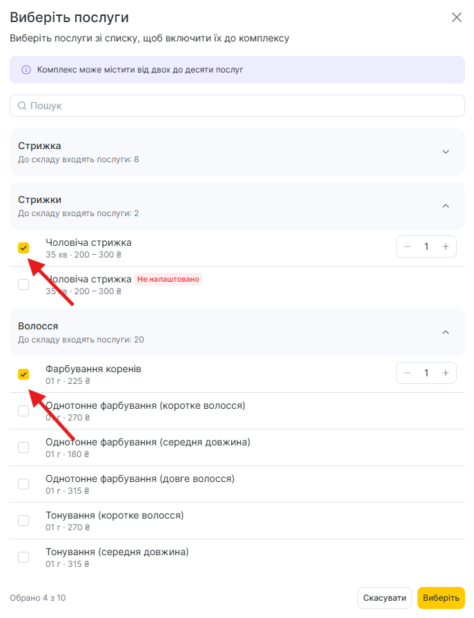 - У відкритому вікні відзначте послуги, які входитимуть до комплексу.