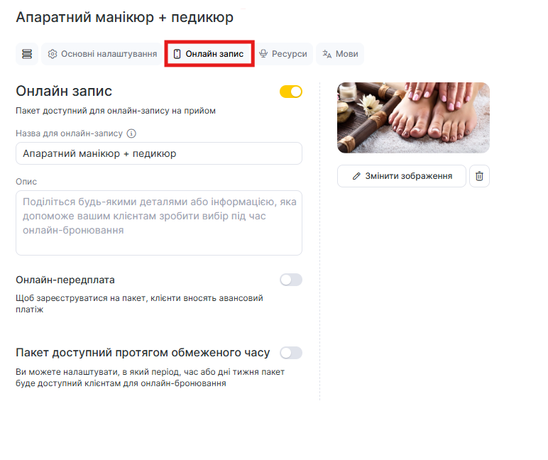 - Для ввімкнення онлайн-передплати на комплекс необхідно перемкнути відповідний повзунок у полі Онлайн-передплата. За умови увімкненої онлайн-передплати клієнти зможуть оплатити комплекс у віджеті онлайн-запису. Докладніше про налаштування онлайн-передплати читайте в цій статті.