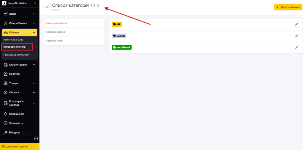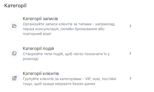 - Категорії клієнтів — групи клієнтів (VIP, нові, постійні тощо).