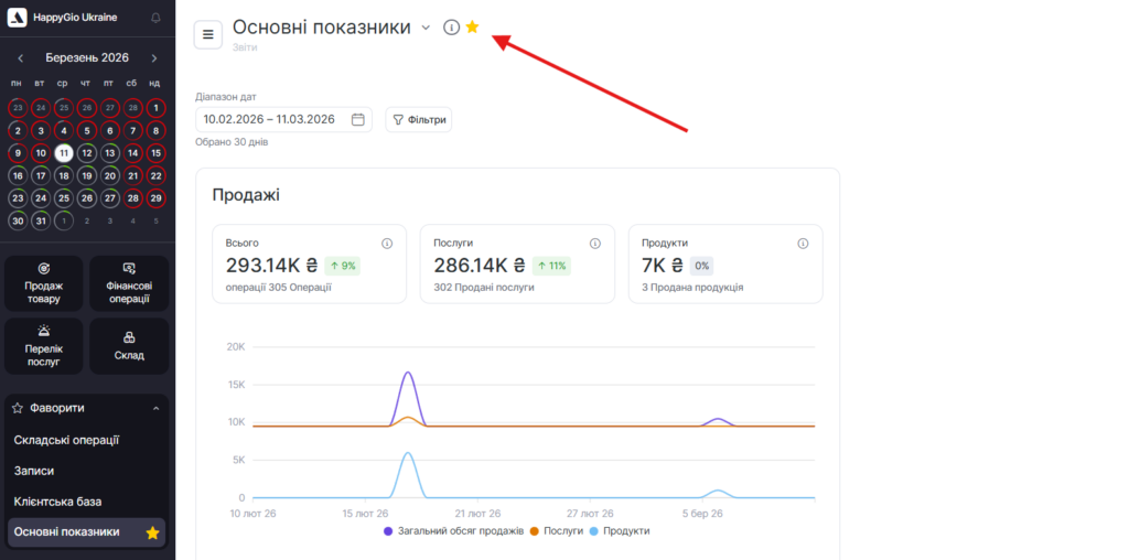 - перехід до важливих розділів через Обране під календарем.