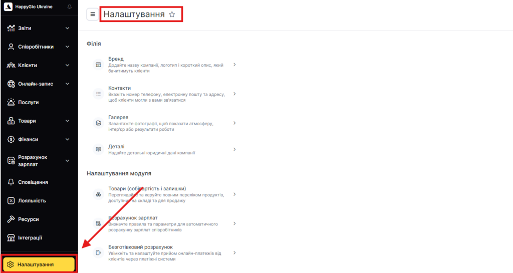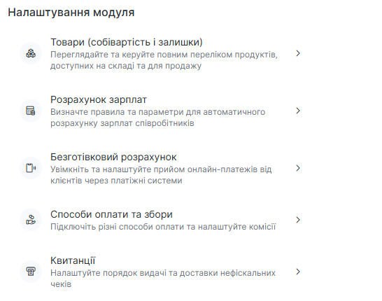 - Безготівковий розрахунок — увімкнення та налаштування онлайн-оплати;