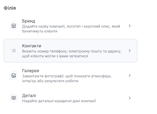 - Бренд — назва компанії, логотип, короткий опис для клієнтів;