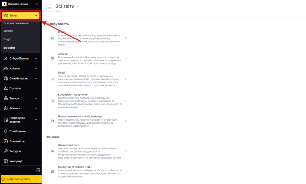 Розділ Усі звіти містить список усіх типів звітів, згрупованих за категоріями (наприклад: Відвідуваність, Фінанси, Продажі, Склад тощо).