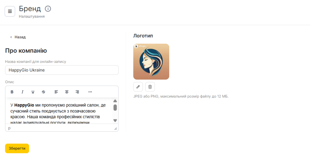 - Завантажте логотип: рекомендована роздільна здатність — 500 × 500 px. Логотип має бути на білому або прозорому фоні. Максимальний розмір файлу — 12 МБ.