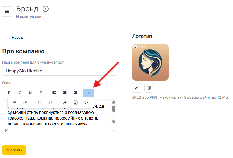 - Додайте опис вашої компанії — це важлива частина віджета онлайн-запису в Altegio. Опис надає клієнтам ключову інформацію про ваш бізнес і допомагає їм ухвалити зважене рішення під час запису. За статистикою Altegio, 24 % клієнтів відкривають цей розділ, тому важливо чітко й переконливо донести ваше повідомлення, щоб привернути їхню увагу.
