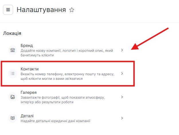 - Перейдіть в основному меню до розділу Налаштування > Локація > Контакти.
