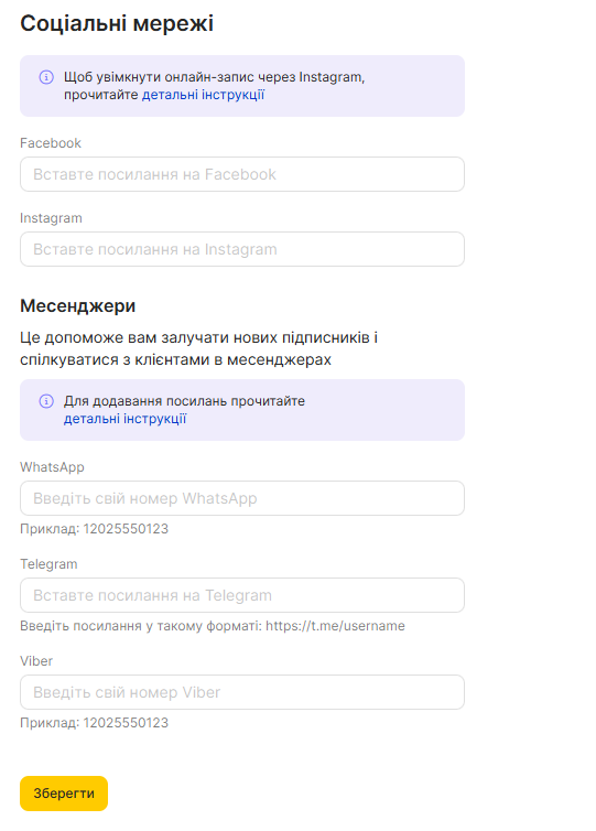Контактні дані відображаються у віджеті онлайн-запису, на сторінці Про компанію та у списку філій. Розміщуються на зовнішніх ресурсах, таких як Google Maps.
