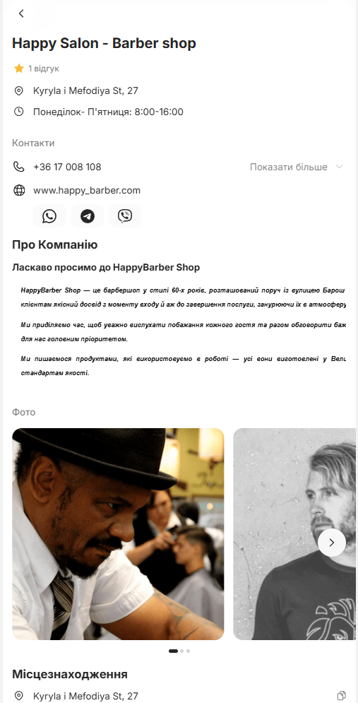 Опис відображається у віджеті онлайн-запису. Тут компанії розповідають про свої переваги, про те, що роблять і для кого, які проблеми клієнтів вирішують.