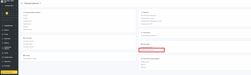 1. Перейдіть у головному меню до розділу «Налаштування» > «Моя філія» > «Інформація про філію».