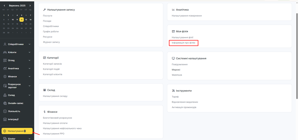 1. Перейдіть в основному меню в розділ “Налаштування” – “Моя філія” – “Інформація про філію”.