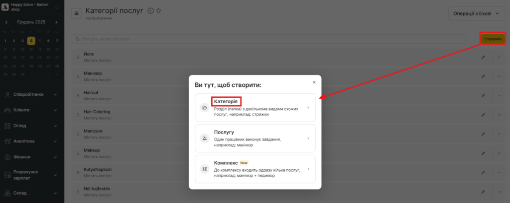 Приклади категорій: стрижки, фарбування, консультації, квести, кузовний ремонт.