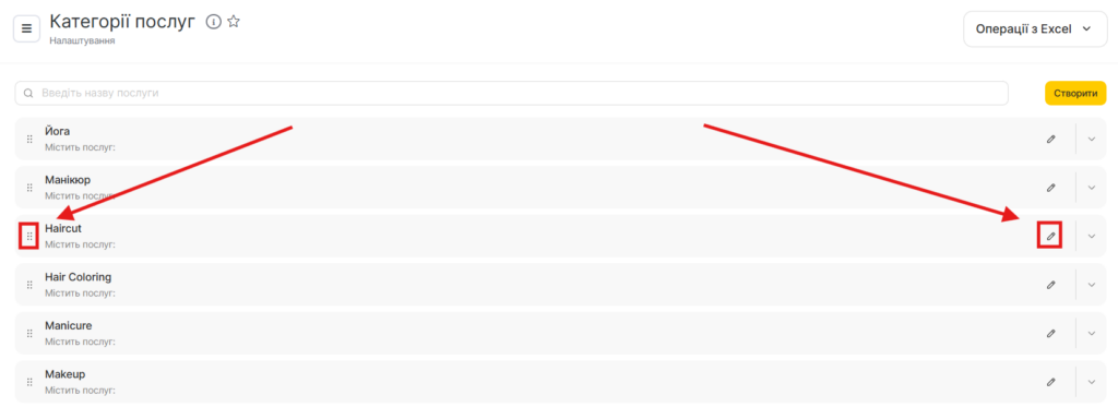 Праворуч і ліворуч від назви категорії є елементи керування — використовуйте їх для редагування та переміщення категорії у списку. Порядок категорій відображається у віджеті онлайн-запису та в журналі запису.