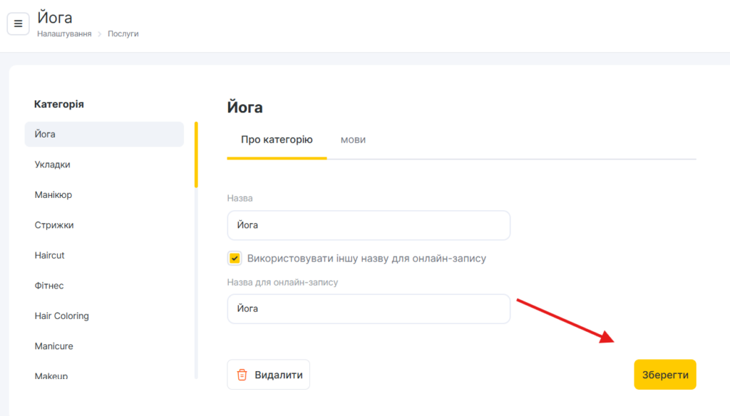 - У полі Назва для онлайн-запису вкажіть назву категорії, яку бачитимуть клієнти під час онлайн-запису.