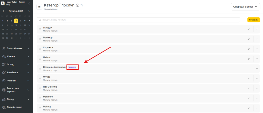 У розділі Налаштування > Налаштування запису > Послуги доступний список усіх категорій із послугами.