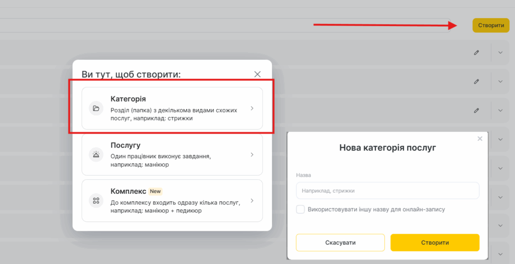 2. Щоб додати нову категорію, натисніть кнопку Створити > Створити категорію. Відкриється нове вікно, в якому потрібно внести назву категорії послуг, наприклад, масажні послуги або чоловічі стрижки, та натиснути кнопку Створити.