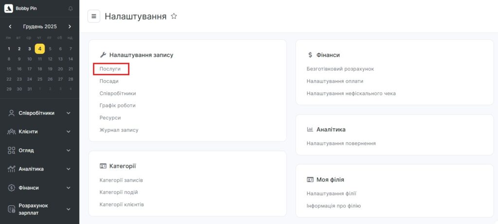 Після того, як «Категорії» додані та налаштовані, додайте та налаштуйте «Послуги» в кожній категорії.