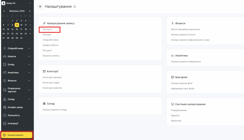 Послуги можна переміщувати за списком усередині категорії, для цього натисніть кнопку з трьома смужками зліва від назви послуги та перетягніть рядок на потрібне місце. Ця послідовність послуг відображається віджетом онлайн-запису та під час створення запису в журналі.